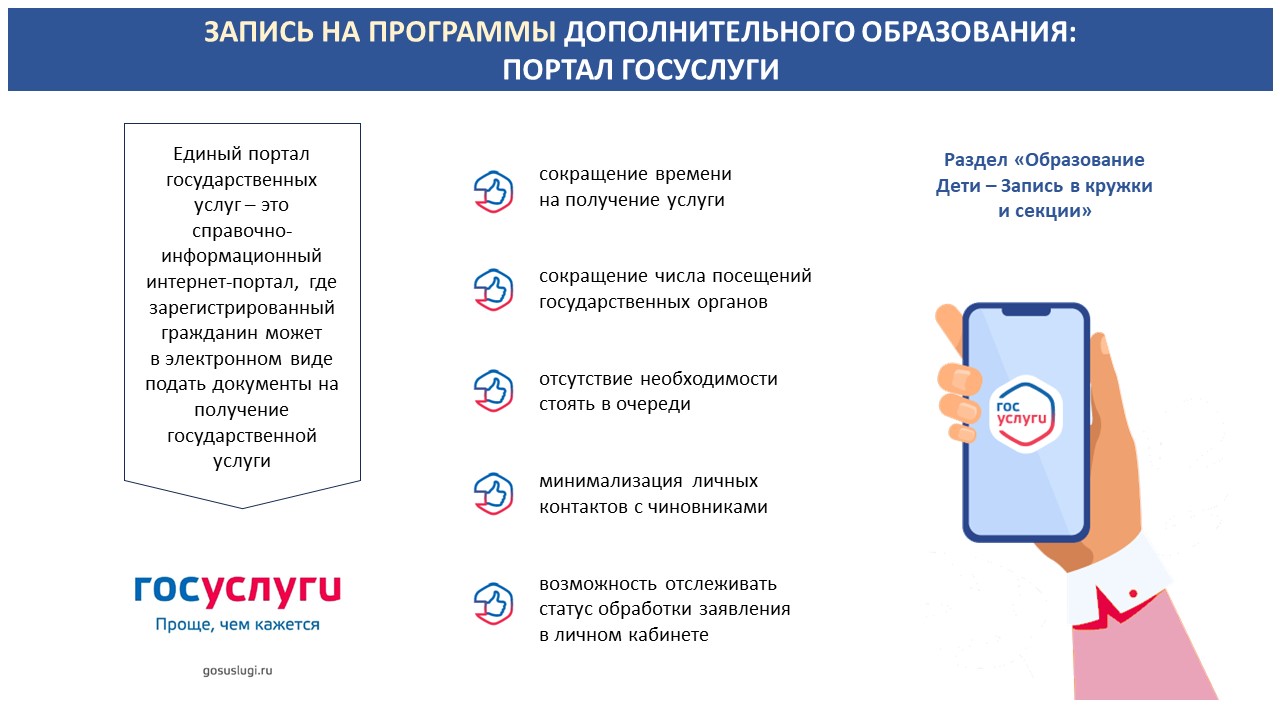 Преимущества получения услуги «Запись на обучение по дополнительной общеобразовательной программе» через ЕПГУ в том, что услугу можно получить быстрее, сократив временные затраты и число личных визитов, исключить необходимость предоставления документов, имеющихся в распоряжении государственных органов. Упустить что-то важное при заполнении анкеты невозможно: электронная форма включает в себя полный список документов, необходимых для получения услуги. Если в процессе заполнения вдруг появятся неотложные дела, портал можно смело закрыть - введенная ранее информация сохранится в черновиках, и в следующий раз вы продолжите работу с того места, где закончили.