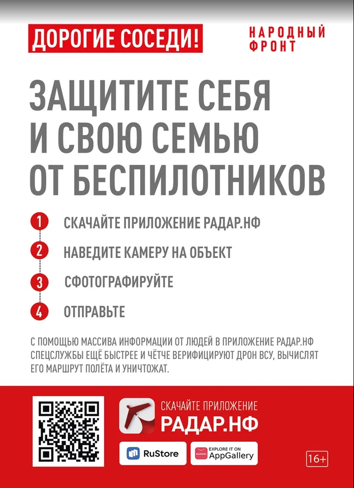 Единственное в России мобильное приложение, позволяющее сообщить об увиденных беспилотниках, взрывах, ракетах, неопознанных подозрительных объектах и деятельности диверсионно-разведывательной группы. Все сообщения незамедлительно передаются для обработки ответственным сотрудникам государственной власти. Помощь граждан в обнаружении летательных аппаратов крайне важна: оружие врага будет своевременно уничтожено.