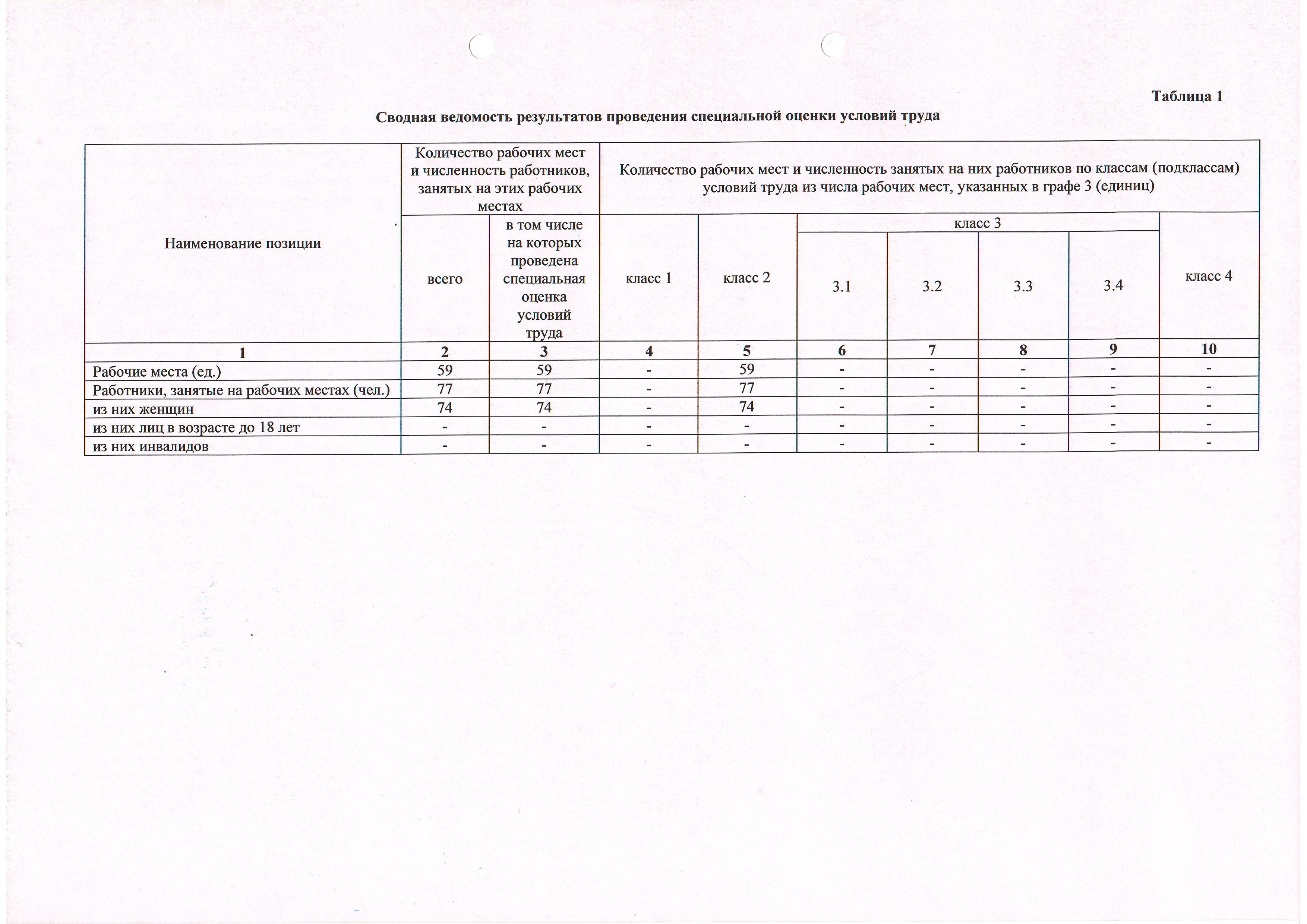 Сводная ведомость результатов проведения специальной оценки условий труда